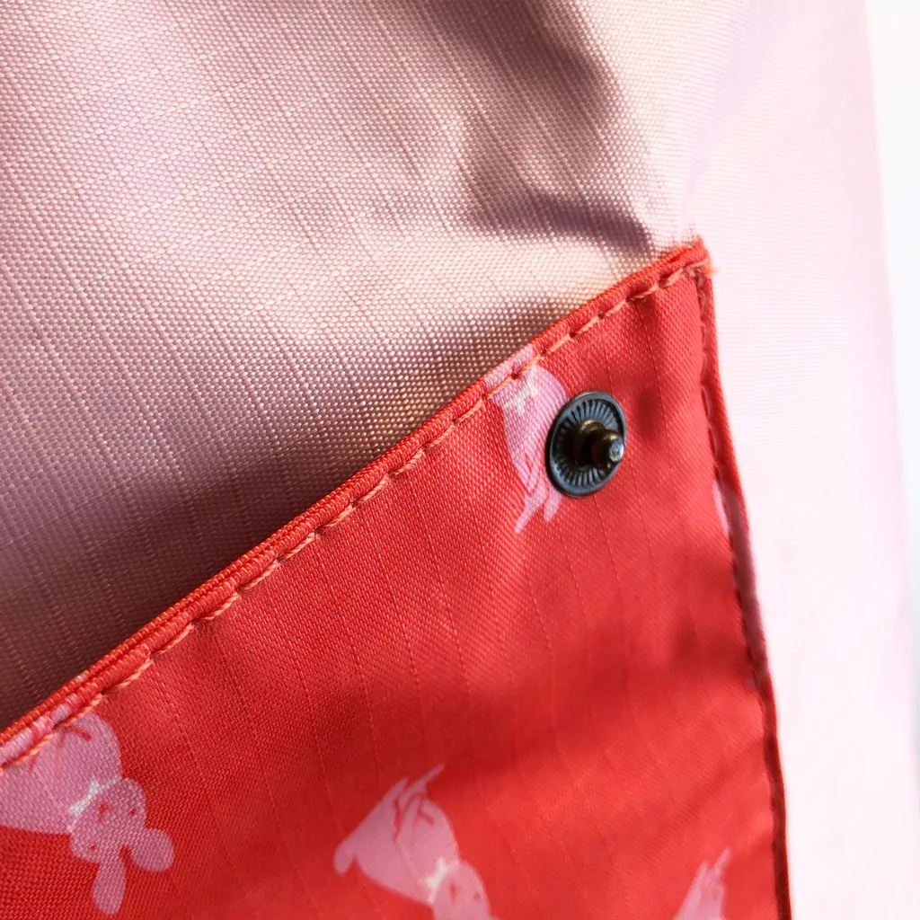 Tote bag: De tela impermeable reforzada, tiene una protección interior para que no se manche ni se moje. Tiene bolsillo exterior y se guarda chiquita (se cierra con 2 cerrojos metálicos)